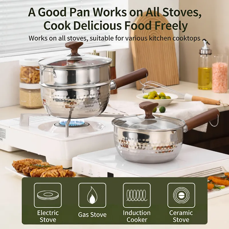 Hammer Pattern Design & All Stovetops Compatible: Features a stylish hammered texture for anti-scalding and heat distribution, compatible with gas, induction, electric, and ceramic stovetops for versatile home cooking.