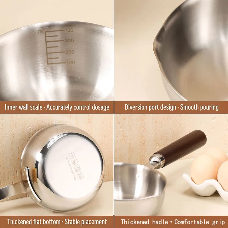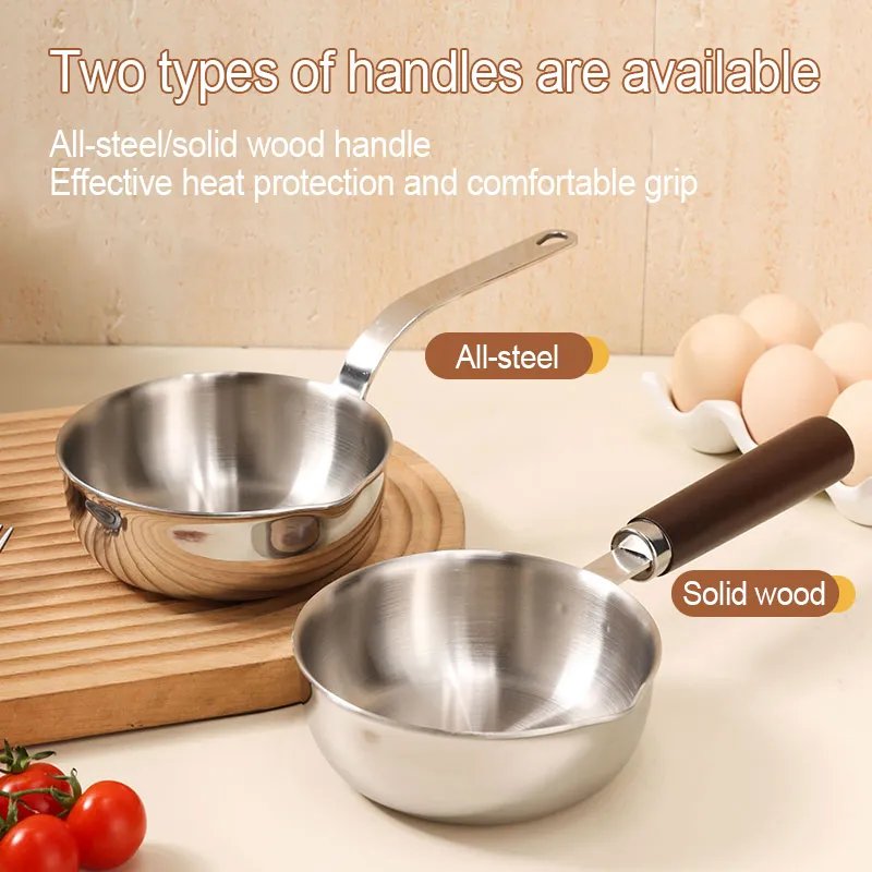 This stainless steel mini frying pan offers two handle styles for your choice: wooden handle and steel handle. It has a capacity of 400 milliliters. It is perfect for frying eggs or cooking small portions of food. Choose us and you can enjoy our high-quality products, competitive prices and excellent customer service.
