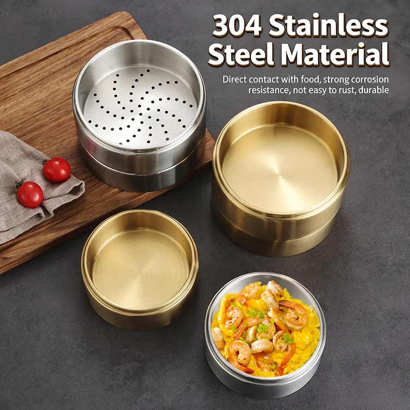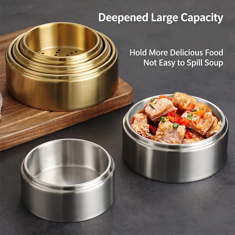 Dual Color & 3 Size Options: Available in classic silver and luxurious gold finishes, with 3 practical sizes (11cm/13cm/15cm) to suit diverse serving and cooking needs. The stackable design allows space-saving storage when not in use.