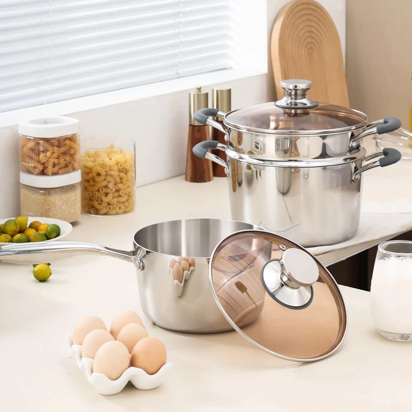 Ergonomic Silicone Anti-Scald Handles: Equipped with food-grade silicone heat-insulated grips on all dual-handle pots, staying cool to the touch during cooking for a safe, comfortable, non-slip grip. The single-handle milk pot features a sturdy, riveted stainless steel handle for secure maneuvering.