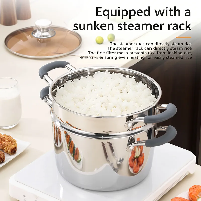 Our 304 stainless steel steam stock pot comes with 18/20/22/24/26/28cm options. It features food-grade silicone anti-scald handles for safe gripping, a 3-layer steel structure for uniform heating, and a included steamer basket. Suitable for all stovetops, it’s durable, easy to clean, and factory-direct for healthy family cooking.