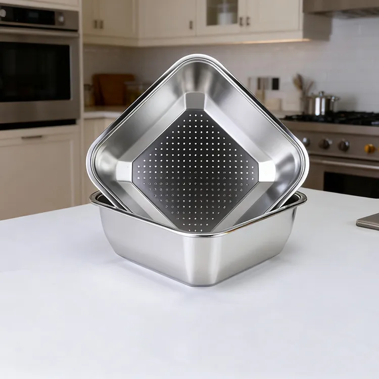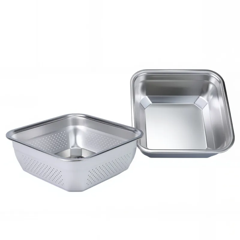 Stainless steel square washbasin and drain basin set, suitable for cleaning, draining and food preparation, easily handling vegetables, fruits, rice, pasta and other ingredients. Whether it is a home kitchen or a commercial kitchen, it is an ideal choice that is efficient and reliable. Upgrade your kitchen and choose this essential tool. It’s the ideal choice for wholesale purchases. Contact us immediately to get the wholesale price!